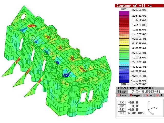 E’ stata svolta quindi una analisi dinamica sul modello tridimensionale, applicando come storia di carico gli accelerogrammi rilevati durante il sisma (Figura 6), per determinare il grado di sollecitazione nei punti più critici della Basilica, come l’imposta delle volte e gli archi trasversali che reggono le vele.