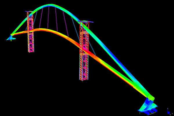 sono incastrate su questo, e sorrette verso l'estremita' a sbalzo da funi ancorate all'arco superiore.