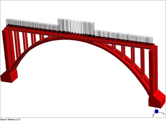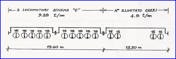 La struttura è stata discretizzata mediante 19421 nodi e 11776 elementi solidi (brick) ad otto nodi. Si procede ad analizzare la risposta statica del ponte alle azioni permanenti ed indotte dai carichi accidentali relativi ai ponti di categoria RIV. A. Sono stati presi in considerazione gli effetti di una stesa di carico costituita da 2 locomotori che determinano un carico equivalente di 9,28 t/m e da un numero illimitato di carri del peso equivalente di 4,80 t/m.