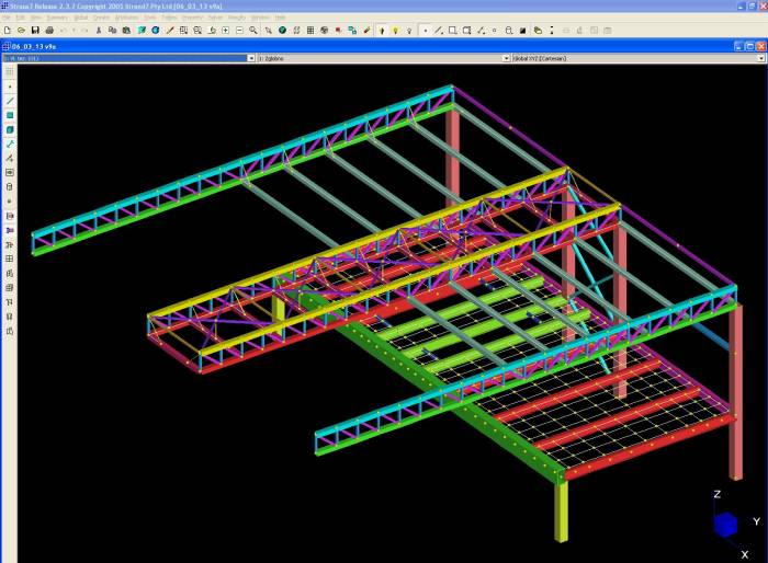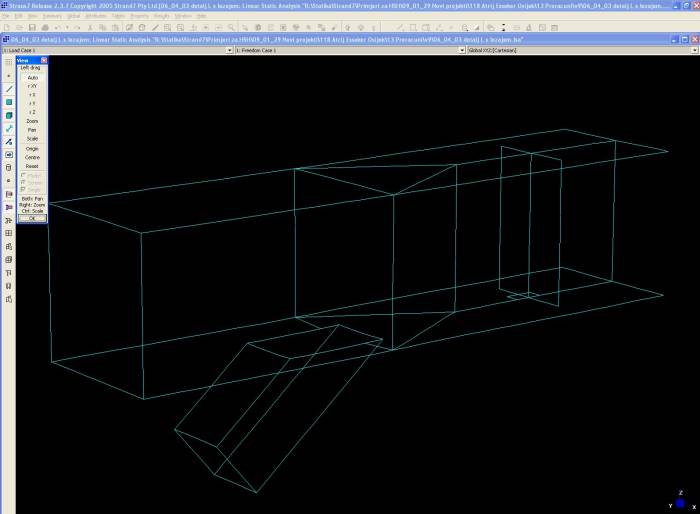 For the statical analysis of structure, a three-dimensional beam and plate model is made. The model contains all elements of the structure except the moving part of the roof, which is simulated by groups of concentrated forces.