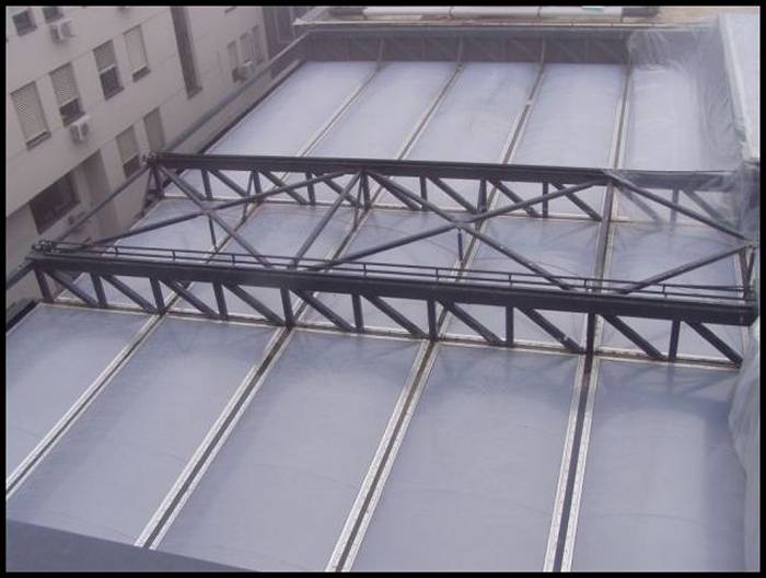 The primary elements of the roof structure are 1.1m high steel trusses spanning 29.5 m. On one side, the roof structure rests on a concrete parapet at the 2nd floor of a building and on the other side at the ground level. The distance between the main trusses are 10.4 m and 4.5 m respectively. Secondary beam are connecting the trusses. The roof is covered with 3-skin ETFE cushions. The cushions are fixed on the top of the primary and secondary steel structure.