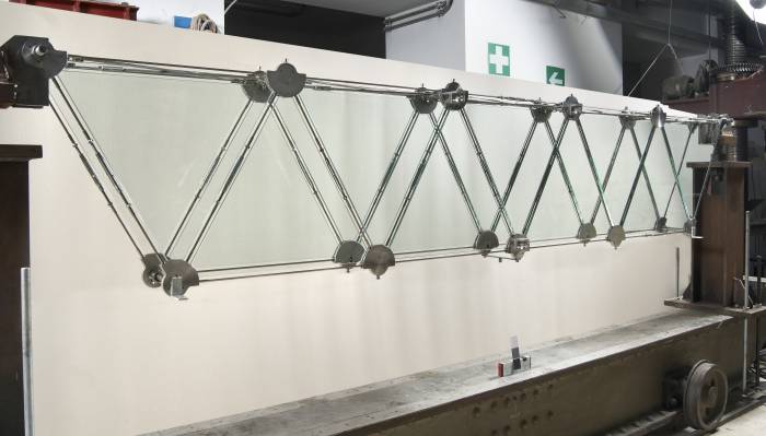 Sono state svolte analisi parametriche per valutare l’influenza della forza di pretensione dei cavi sul comportamento meccanico della trave, analisi di stabilità locale delle lastre di vetro ed analisi di stabilità flessotorsionale globale della trave, mettendo in conto imperfezioni di carattere geometrico e meccanico.