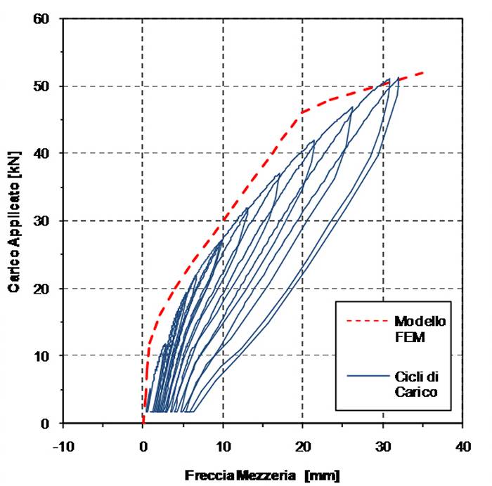 Il comportamento strutturale della trave risulta essere condizionato dal grado di vincolo interno dei nodi metallici, modellato con elementi point-contact, e dalle non linearità offerte dai tiranti pretesi (cuttof bar), si è cercato pertanto di includere nel modello numerico, per quanto possibile, questi fattori che risultano essere determinanti per lo studio della risposta meccanica della trave.