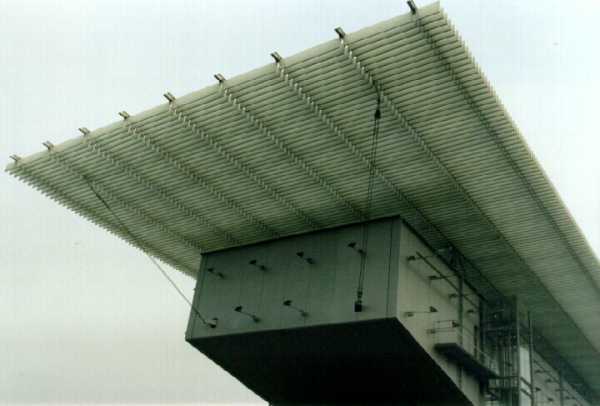 Il grande pannello frangisole superiore ha una struttura a graticcio piano, formata da 2 serie di tubi rettangolari ortogonali tra loro e solidarizzati con saldatura nei punti di incrocio. Per ridurre la deformabilità nei riguardi delle azioni dinamiche dovute al vento, il pannello è ancorato in 8 punti con cavi pretesi alla sottostante struttura della sala mostre. L’entità delle pretensioni è tale da evitare che i cavi vadano "in bando" anche nelle condizioni più sfavorevoli di azione del vento.