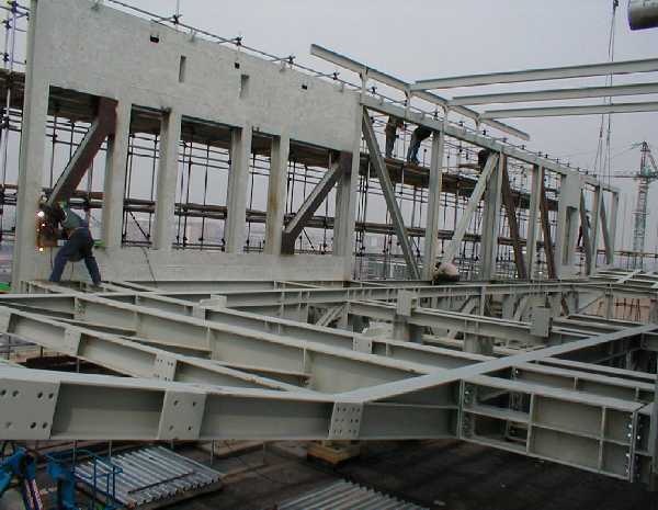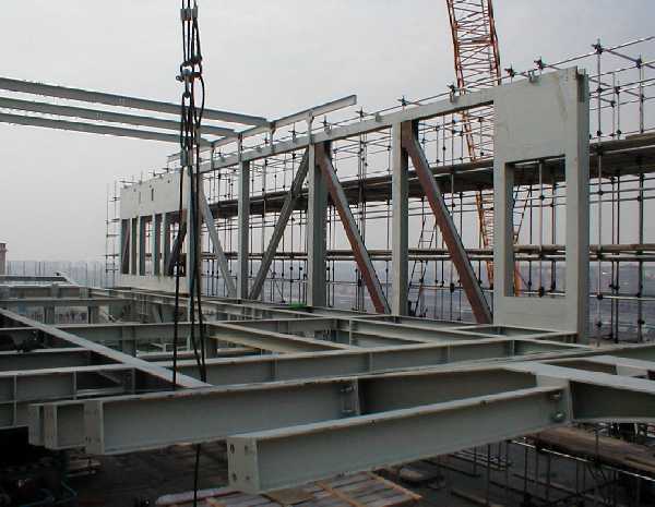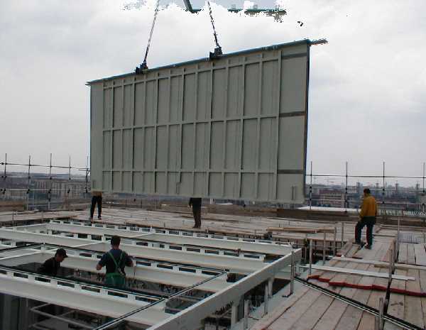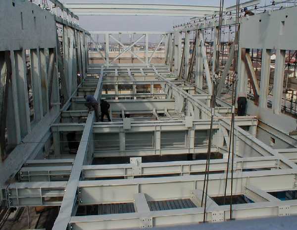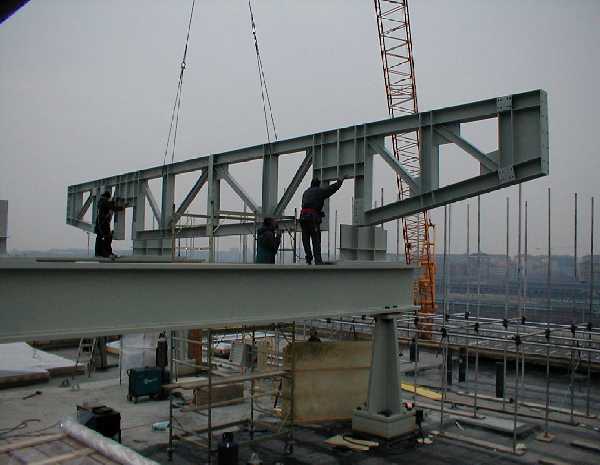 Date le caratteristiche di scarsa portanza delle strutture del fabbricato esistente tutto il montaggio è stato fatto con una gru posizionata a terra. L’altezza di sollevamento è di circa 43 m, la larghezza del fabbricato di circa 80 m e lo sbraccio massimo di conseguenza è di circa 50÷60 m. E’ stata prevista una gru di grande portata in grado di sollevare carichi di circa 25 t alle distanze sopraindicate, in modo da poter prefabbricare, in officina e/o in aree di lavorazione predisposte a terra, grandi blocchi di strutture e ridurre al minimo i giunti da eseguire in opera.