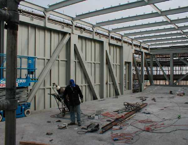 In corrispondenza delle aperture per le porte di ingresso, che impediscono il posizionamento di diagonali necessarie al funzionamento a trave reticolare, sono stati previsti pannelli irrigidenti in lamiera saldata che definiscono campi con funzionamento a trave tipo Vierendeel.