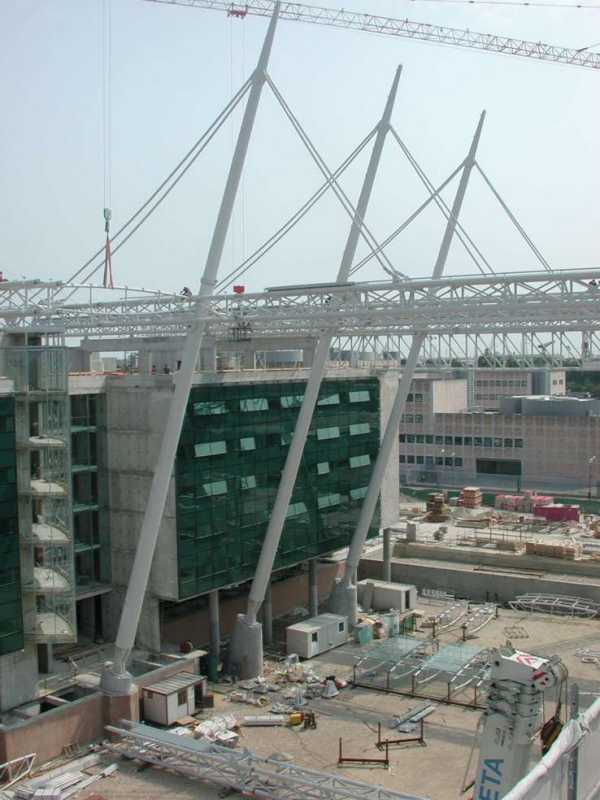 La copertura si estende su una superficie di 117 x 95 m (11.115 mq). La struttura portante è costituita da un graticcio di travi in acciaio, in cui si può leggere un’orditura principale di travi reticolari con sezione a cassone, poggianti alle estremità sui due corpi dell’edificio e nella parte mediana sui due pennoni strallati, e una secondaria di capriate reticolari piane. L’orditura principale è in effetti realizzata da cinque travi reticolari a cassone di sezione quadrata di 1.40 x 1.40 m poste ad interasse di 15.40 m e due travi laterali reticolari a cassone di sezione complessiva rettangolare di 3.50 x 2.50 m che poggiano sulle parti estreme del blocco hotel e del residence e collegano i due blocchi con una passerella pedonale ricavata all’interno delle strutture. Ogni trave principale appoggia sui corpi dell’ edificio e, nella parte mediana, è sostenuta da due piloni d’acciaio a sezione tronco-conica che, inclinati di 71.34° rispetto l’orizzontale, raggiungono la quota + 44.55 m. In prossimità della punta di ogni pilone partono 2+2 stralli di acciaio per poi agganciarsi ai due correnti superiori delle travi principali.