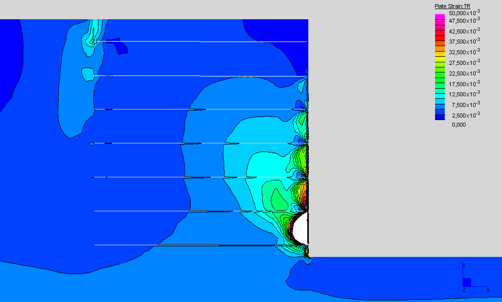 Aumentando la rigidezza dei chiodi di due ordini di grandezza (Rn = 10) non si fa più la formazione di una banda di taglio, rimangono tuttavia delle zone di terreno plasticizzato a tergo della zona chiodata dovute alla spinta ribaltante.