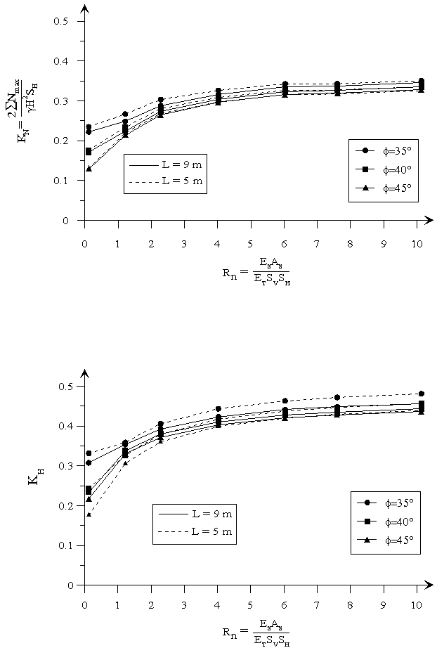 Il fattore di sicurezza nei confronti di questa instabilità è rappresentato nei seguenti diagrammi e dipende dalla rigidezza relativa del chiodo rispetto al terreno.