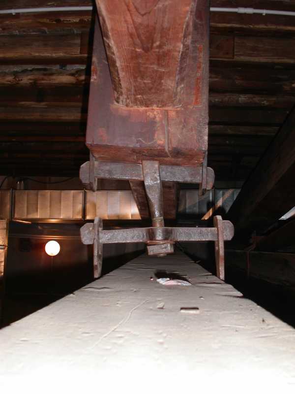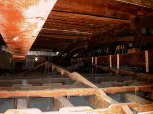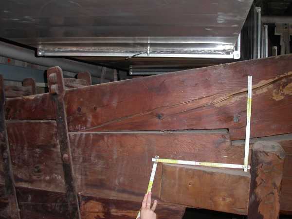 Dall’ispezione effettuata con il prof. Ceccotti del CNR – IVALSA è emerso che dall’aspetto delle fessure, dalla loro ampiezza e dalla loro lunghezza il legno è stato messo in opera non stagionato (con umidità interna pari a circa il 14%) e con il passare del tempo si è asciugato arrivando ad avere una umidità propria del 9%. Questo fenomeno di diminuzione dell’umidità interna è stato accentuato negli ultimi anni dalla realizzazione dell’impianto di riscaldamento che ha notevolmente cambiato le condizioni all’interno dell’ambiente in cui si trova la trave oggetto di studio.