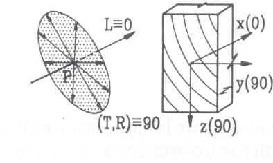In ogni punto della sezione retta di un tronco (sezione normale all’asse dell’albero) si può individuare oltre alla direzione parallela all’asse dell’albero in quel punto (direzione longitudinale L, normale al piano della sezione), una direzione tangente all’anello di accrescimento annuale in quel punto (dir. tangenziale), ed una direzione normale alla direzione tangenziale nel punto (direzione radiale R): tali direzioni costituiscono le tre direzioni di ortotropia (fig 13).