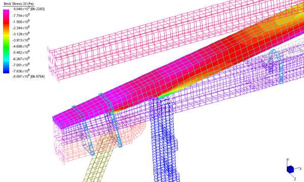 Dall’analisi numerica è stato possibile verificare che nelle zone centrali delle aste, lontano dagli appoggi il valore degli sforzi ottenuto con un a modellazione con elementi brick è del tutto simile a quello derivante da una modellazione con elementi beam (fig 19).