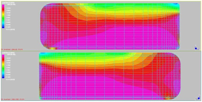 Analisi del Modello - L’analisi svolta è di tipo non lineare (Nonlinear Static) in quanto la matrice di rigidezza della struttura cambia al variare delle condizioni di contatto sulla superficie della giunzione di testa. I passi di carico seguono la successione delle operazioni di prova: la precompressione della giunzione di testa e della scatola di afferraggio, la tesatura del cavo di sicurezza; l’applicazione del carico di prova. Come nella prova di carico anche nella simulazione numerica il livello tensionale nel vetro rimane molto al di sotto del valore della tensione di rottura. In particolare è stato possibile apprezzare l’ottimo trasferimento delle tensioni di trazione in corrispondenza dell’incollaggio delle canalette metalliche in quanto il livello tensionale misurato in zona tesa è caratterizzato dagli stessi valori misurati in zona compressa.