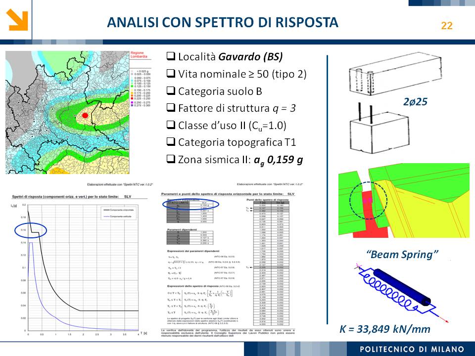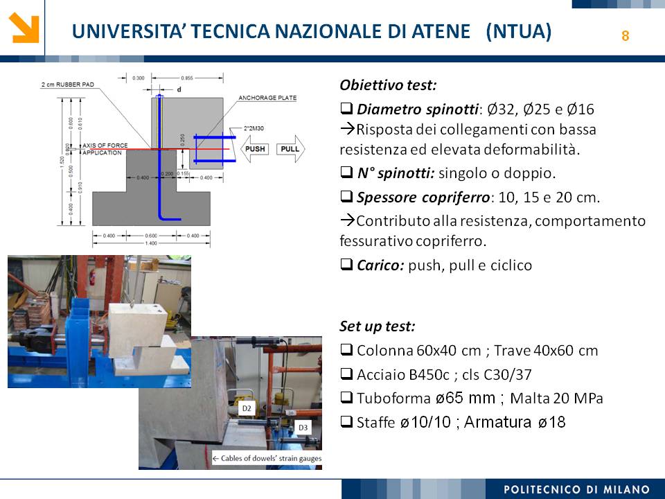 L’obiettivo dello studio presentato è qualificare e quantificare i parametri caratteristici del comportamento sismico, in termini di spostamento, resistenza, rigidezza e duttilità, delle connessioni a spinotto trave – colonna correntemente impiegate nelle strutture industriali prefabbricate. Queste connessioni sono tipicamente costituite da barre di acciaio ancorate nel pilastro e passanti in appositi alloggiamenti della trave, successivamente annegati con malta, in modo da garantire un comportamento pressoché a cerniera nel piano verticale e un comportamento rigido nel piano orizzontale. Nella tesi è riportata un’analisi parametrica relativa alle formulazioni attualmente presenti in letteratura per la valutazione della resistenza di tali connessioni, al fine di sottolineare pregi e difetti di ognuna. Viene inoltre presentata la procedura necessaria a caratterizzare il comportamento del collegamento in termini di forza-spostamento, sia a snervamento sia a rottura, mediante curva “Bi-Lineare” e “Tri-Lineare”. Tali procedure sono verificate attraverso una campagna sperimentale, realizzata nell’ambito del progetto di ricerca Europeo SAFECAST, di cui si riportano i set up delle prove e i risultati ottenuti per storie di carico sia monotono sia ciclico; i test sono stati condotti fino allo spostamento ultimo, in modo da determinare, in maniera dettagliata, la curva forza-spostamento caratterizzante la connessione. La definizione “Bi-Lineare” e “Tri-lineare” del comportamento del collegamento spinottato è stata applicata nella modellazione ad elementi finiti di due strutture prefabbricate monopiano ad uso industriale, simmetrica e non, realmente esistenti. Su tali strutture sono state condotte analisi dinamiche non lineari, Time History, al fine di evidenziare la differente risposta, da parte dell’edificio soggetto a sisma, tra l’innovativa modellazione della connessione spinottata con elementi “Beam Spring” e il classico vincolo a semplice cerniera, attualmente adottato nella comune pratica progettuale. Lo studio presentato cerca di colmare le lacune nella conoscenza del comportamento sismico delle connessioni spinottate trave-colonna, promuovendo lo sviluppo di strumenti numerici appropriati, attendibili e verificati sperimentalmente, da utilizzare nella progettazione di strutture prefabbricate in zone sismica sfruttando le proprietà delle stesse connessioni. Il software utilizzato per le modellazioni FEM e' il codice di calcolo Straus7. |