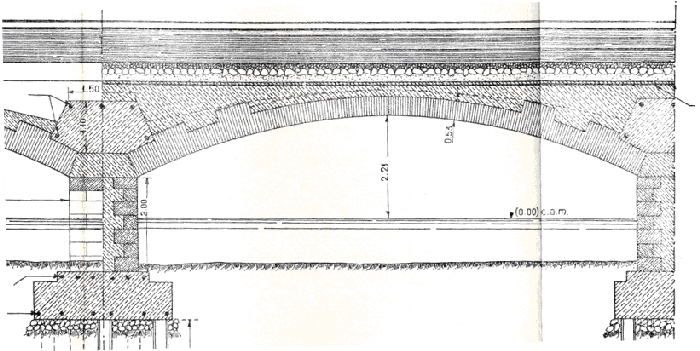L’analisi dell’aspetto più particolare e forse interessante del ponte è rappresentata dallo studio della collaborazione tra l’arco in muratura e la nervatura in calcestruzzo presente sopra lo stesso (Figura 1), agevolata dalla presenza di due denti in muratura. Con il software Straus7 è stato creato un modello ad elementi plate ed elementi beam di tipo point contact (Figure 2 e 3), con cui è stata effettuata un’analisi quasi-statica volta a studiare il meccanismo sottoposto ai fenomeni lenti di ritiro e viscosità differita, eseguendo il confronto tra due differenti modelli ad elementi finiti (Figura 4). In secondo luogo è stata eseguita un’analisi non-lineare con i carichi previsti dalle NTC 2008 (Figura 5), confrontando infine i risultati con un terzo modello più affinato (Figure 6 e 7).