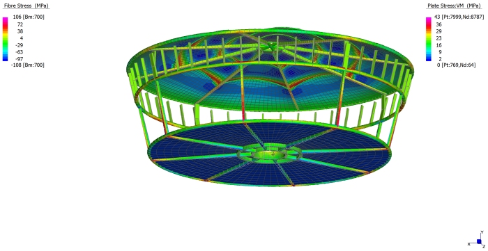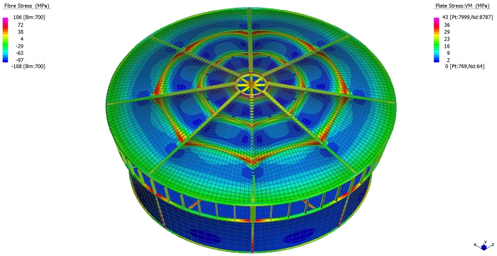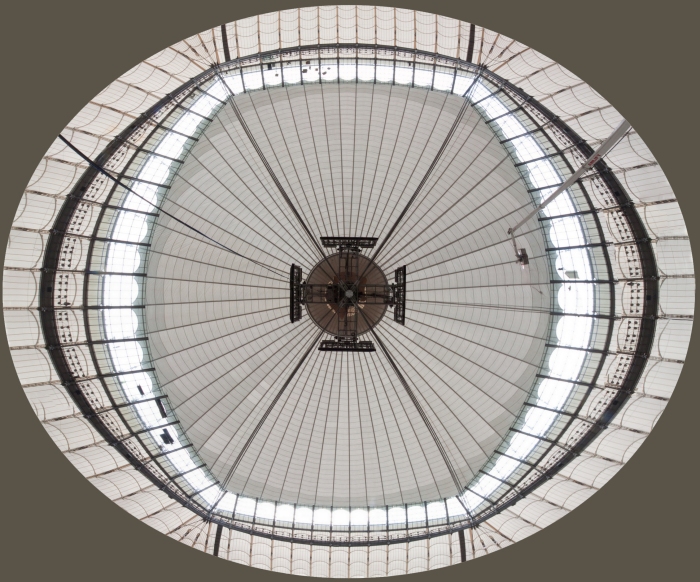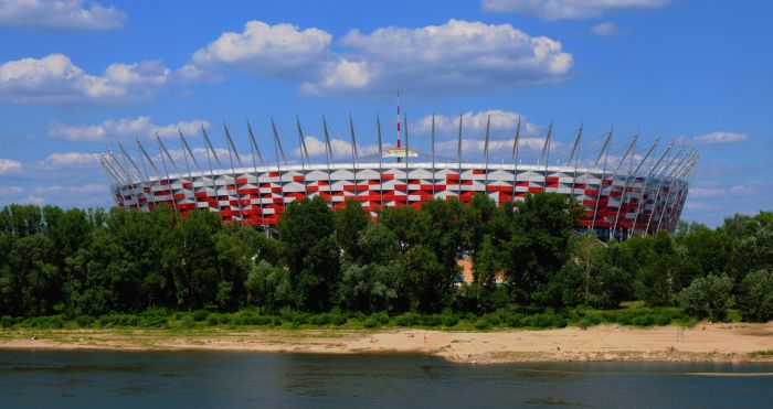 Il nuovo stadio nazionale di Varsavia ha una capienza di 55.000 posti a sedere. La copertura, del peso complessivo di 15.000 tonnellate, e' una tensostruttura sull'intera superficie, completamente ancorata dall'esterno mediante un meccanismo a sviluppo circolare formato da 72 colonne (profilo CHS 1016mm x 30-70mm) disposte in pianta lungo una circonferenza di 300 metri di diametro, un anello di contrasto detto compression ring (profilo CHS 1820mm x 80mm), pennoni di appensione dei cavi, detti inclined struts (profilo CHS da 1200 a 600mm x 35-45mm), contrasti di ancoraggio esterno, detti facade tie (profilo CHS 508mm x 20-50mm). La copertura vera e propria e' realizzata mediante un doppio ordine di cavi radiali (72 superiori di diametro 70-140mm e 72 inferiori di diametro 70-150mm) che, partendo dal perimetro esterno della struttura, convergono verso il centro e si ancorano sul mozzo centrale, detto centerspire. Il centerspire e' sospeso sulla verticale di centrocampo, ha una sezione tubolare di dimensione variabile da 1600x25mm a 300x5mm, ha un'altezza di 70m e pesa 200t. Lungo il fusto del centerspire sono ancorati il cosiddetto garage ed il video cube. Il garage e' la struttura a forma di pagoda circolare che contiene la membrana retraibile di copertura, movimentata da quattro argani quando il tetto e' in posizione chiusa. Il video cube e' la struttura di supporto dei maxischermi. E' costituito da 4 bracci reticolari disposti a croce. Ciascun braccio sostiene uno schermo del peso di 8t. |