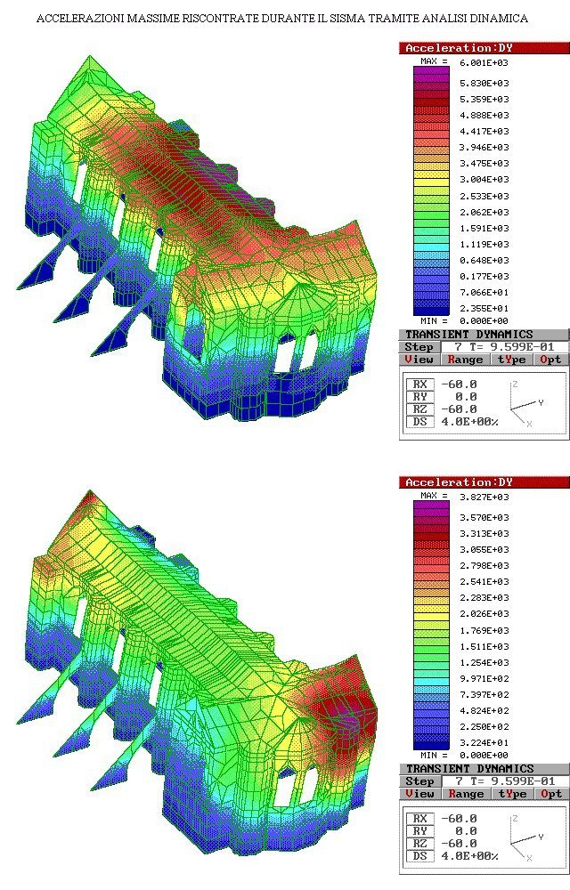 E’ stata svolta quindi una analisi dinamica sul modello tridimensionale, applicando come storia di carico gli accelerogrammi rilevati durante il sisma (Figura 6), per determinare il grado di sollecitazione nei punti più critici della Basilica, come l’imposta delle volte e gli archi trasversali che reggono le vele.