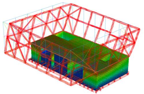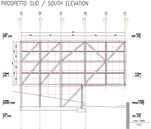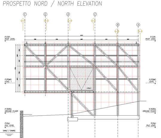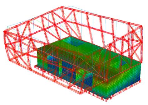 Nella modellazione gli orizzontamenti sono considerati infinitamente rigidi nel proprio piani e i pali sono modellati come molle (le costanti elastiche assunte sono state determinate dalla relazione geologica/geotecnica) .  L’analisi del manufatto è stata condotta con l’ausilio del codice di calcolo Straus7.