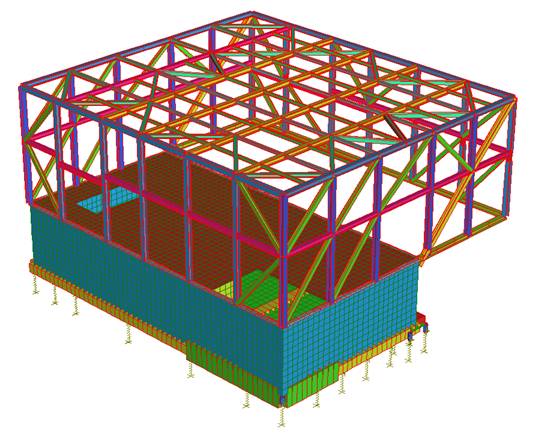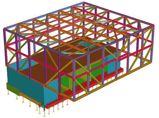 Al fine di determinare la risposta sismica della struttura si adotta il metodo di analisi modale con spettro di risposta o “analisi lineare dinamica” (R.I. §7.3.3.1).  Nell’analisi modale, che rappresenta il metodo di riferimento per determinare gli effetti dell’azione sismica sia su sistemi dissipativi che non dissipativi, l’equilibrio è trattato dinamicamente e l’azione sismica è modellata direttamente attraverso lo spettro di progetto. Per studiare il comportamento delle struttura è stato realizzato un modello tridimensionale ad elementi finiti capace di rappresentare in modo adeguato le effettive distribuzioni spaziali di massa, rigidezza e resistenza della struttura.  Il modello rappresenta l’intera struttura nel suo complesso, parte seminterrata e parte superiore in carpenteria metallica.  Le travi, le colonne in carpenteria metallica e le travi di fondazione in c.a. sono modellate con elementi beam; la platea di fondazione, le pareti del piano seminterrato e la soletta della galleria espositiva centrale è stata invece modellata con elementi plate.