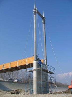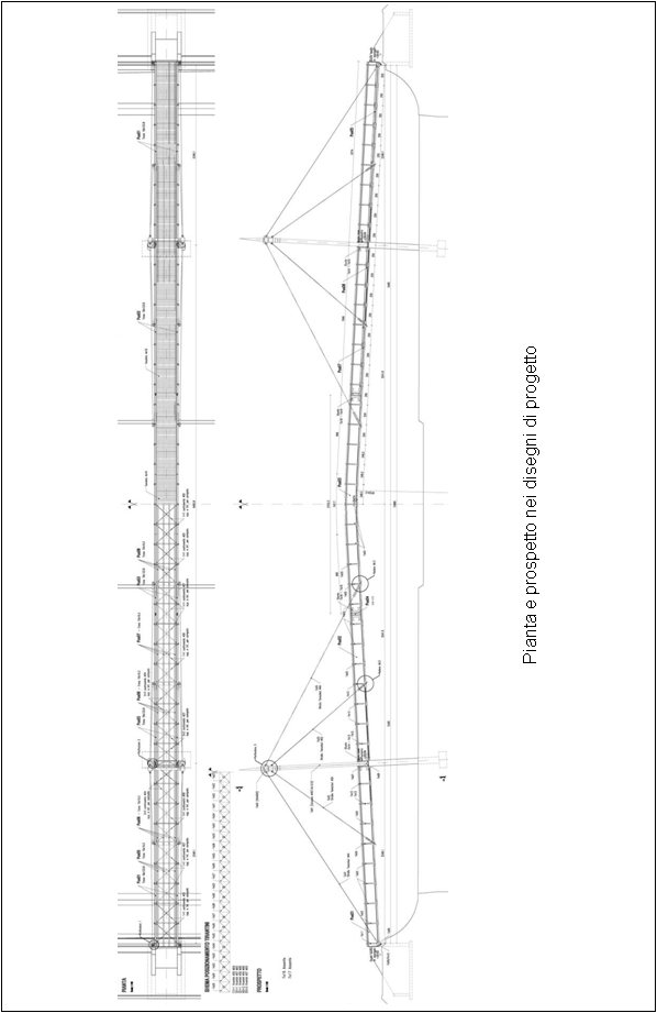 Ciò si è reso possibile assemblando e piè d’opera i cinque conci di impalcato e studiando 9 diverse fasi costruttive a partire dal montaggio dei portali reggistralli fino alla configurazione finale della struttura. Seguendo tali fasi, giocando sulla tesatura degli stralli e misurando in continuo le deformazioni mediante un distanziometro laser di alta precisione puntato su mirini appositamente collocati nei punti critici della struttura, si è proceduto fino al completamento del montaggio.
