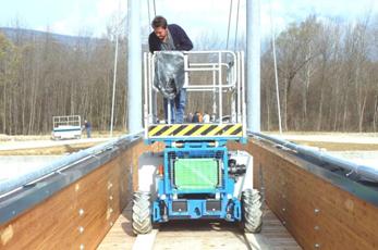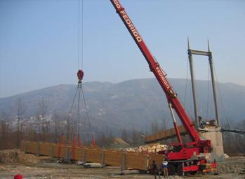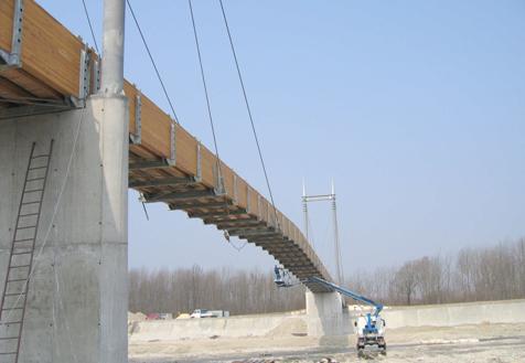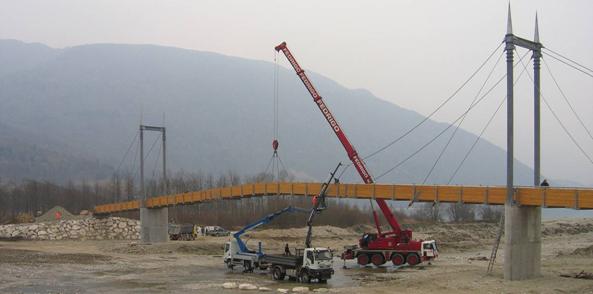 Tale sistema oltre a consentire il varo dell’intera struttura in soli tre giorni, ha consentito già in fase di montaggio di verificare la correttezza delle calcolazioni statiche effettuate grazie al raffronto tra le deformazioni misurate e quelle previste dal calcolo. Il tutto è stato ulteriormente confermato dalla prova di carico effettuata a fine lavori durante la quale si è riscontrato un abbassamento di 14.50cm al centro del ponte a fronte del carico massimo previsto durante l’esercizio del manufatto. Il carico di collaudo è stato raggiunto facendo stazionare sul ponte 28 piattaforme elevatrici di diverse dimensioni e opportunamente posizionate lungo l’intera lunghezza dell’impalcato.