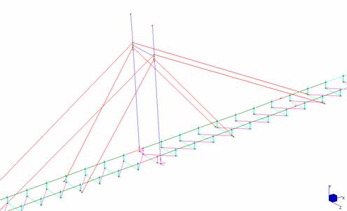 Per garantire un comportamento uniforme sotto le deformazioni indotte dai carichi accidentali e dalle azioni termiche si è adottato uno schema statico perfettamente simmetrico per tutti gli elementi costituivi, in particolare l’impalcato risulta essere una trave continua vincolata in semplice appoggio scorrevole sia sulle pile che sulle spalle. La labilità del sistema è stata evitata connettendo gli stralli laterali direttamente sulle spalle.