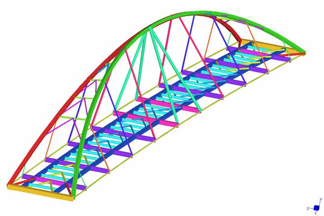 La figura rappresenta il modello di una passerella, realizzato in Straus7 utilizzando elementi tipo ‘beam’. Straus7 dispone di un ambiente di pre-processamento che consente di costruire in modo efficiente e veloce modelli quali quello di figura, e, attraverso il rendering, di verificarli.