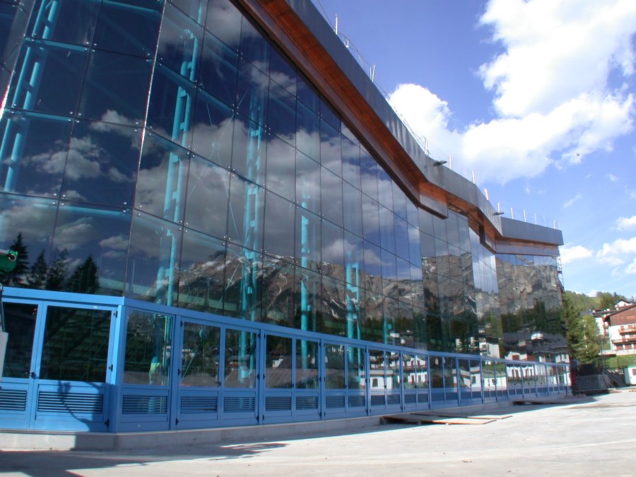 Lo stadio olimpico di Cortina era stato costruito in occasione delle VII olimpiadi invernali del 1956, con una forma ad U che copriva tre piani di gradinate per gli spettatori, lasciando il campo per le attivita' sportive su ghiaccio interamente scoperto. Il progetto realizzato nel 2003, ha permesso di coprire senza colonne intermedie il campo (circa 3400m2 di superficie) con colmi, impluvi, pendenze concordi con la copertura esistente delle gradinate senza peraltro appoggiarsi ad essa. Cimolai ha costruito e montato tutte le strutture metalliche della copertura reticolare e della facciata sud. Lo studio dell'ing. Giorgio Romaro ha utilizzato il codice di calcolo Straus7 per realizzare il modello FEM completo della struttura metallica per tutte le verifiche di resistenza e di buckling in esercizio e per seguire le principali fasi di montaggio.