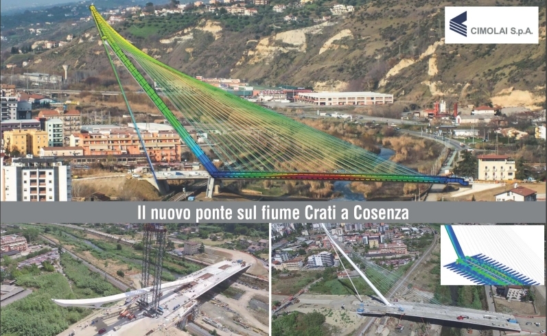 Il ponte sul fiume Crati a Cosenza, realizzato da CIMOLAI SPA, e' fortemente caratterizzato da un'antenna d'acciaio a sezione pseudo ellittica, alta ottantotto metri e inclinata di cinquantuno gradi, incastrata all'impalcato di acciaio lungo centoventicinque metri e largo ventiquattro. La peculiarita' dell'antenna, oltre alla forma, e' costituita dal suo strallo di ammarro, posizionato nel piano longitudinale contenente l'asse impalcato e l'asse antenna. L'impalcato e' costituito da un cassone centrale torsio-resistente e, dai due lati, da sbalzi cadenzati ogni due metri e mezzo atti a sorreggere le carreggiate, ultimate con una soletta di calcestruzzo. Infine il complesso di quaranta stralli simmetrici, anteriori e posteriori, con geometria ad arpa conchiudono la statica dell'opera sulla pila di calcestruzzo e le spalle. E' stato realizzato un modello FEM di calcolo Straus7 comprensivo di pennone, impalcato e cavi, non solo per il calcolo degli stati di esercizio, ma anche per la simulazione, per mezzo della stage analysis, di tutte le fasi di montaggio del ponte, permettendo l'accurata verifica dell'effetto delle situazioni transitorie sulla resistenza strutturale, degli elementi e dei dettagli. Il comando morph, in particolare, ha reso possibile in automatico la delicata descrizione del passaggio tra schemi statici differenti compreso il getto della soletta in calcestruzzo. Sia l'impalcato che il pennone sono stati modellati con elementi di tipo plate, includendo la presenza degli irrigidimenti interni. Le analisi di dettaglio dei nodi sono quindi state svolte direttamente nel modello globale calcolando le tensioni locali in esercizio e durante il transitorio. La pretensione da attribuire ai cavi per raggiungere lo stato deformativo finale desiderato e' stata determinata per mezzo di un codice personalizzato realizzato con l'API (Application Program Interface) di Straus7.