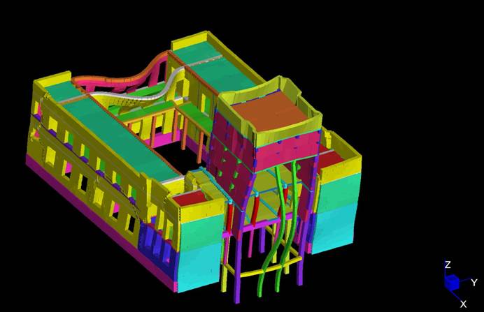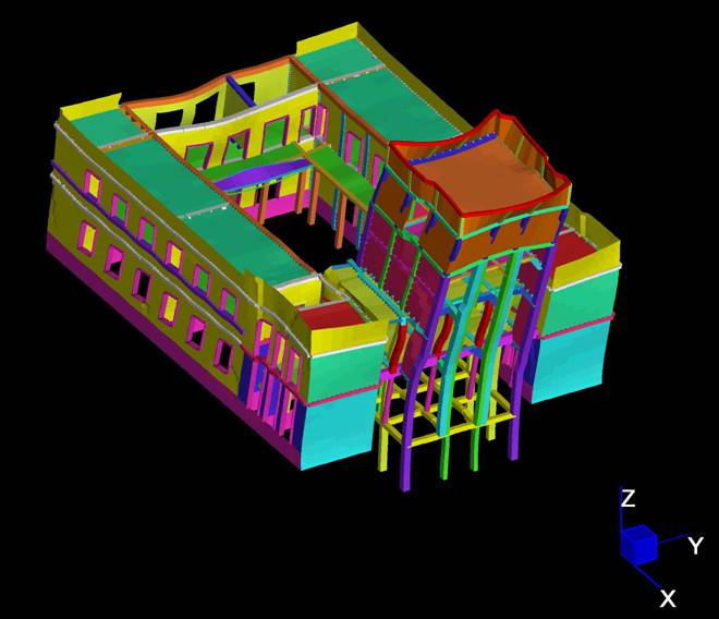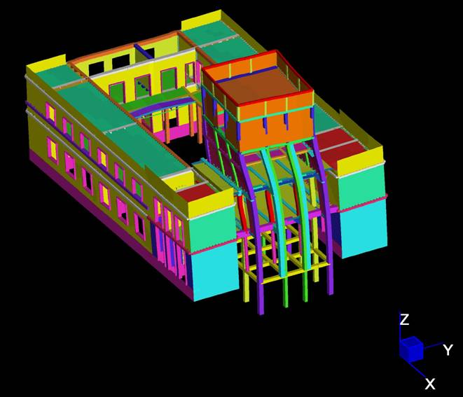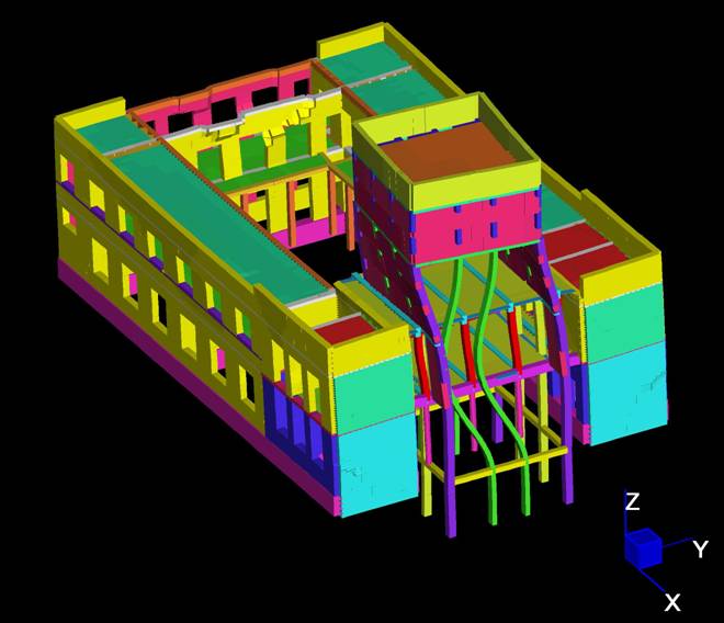 2)      eccesso di torsione del corpo torre per azione sismica ondulatoria lungo y, legata alla manifesta dissimmetria di rigidezza della struttura intelaiata, successivamente costruita;