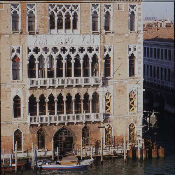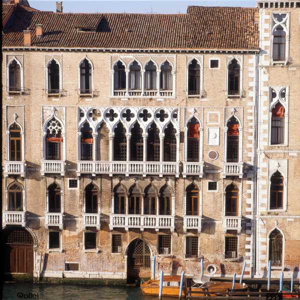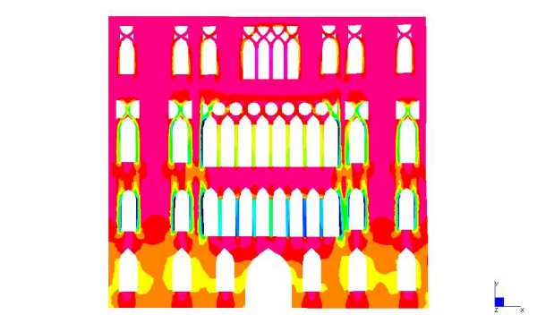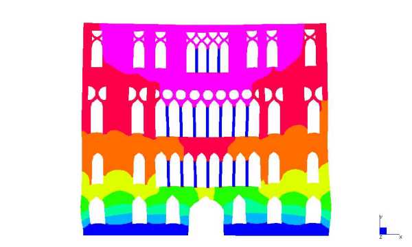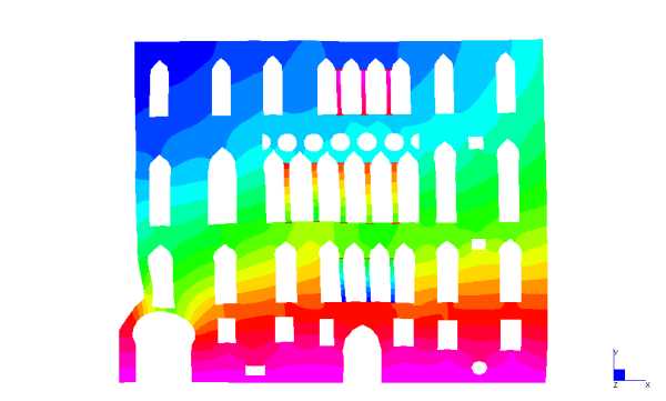 Il progetto di restauro della sede storica dell’Università di Ca’ Foscari composta da più edifici, ovvero Ca’ Foscari propriamente detta, Ca’ Giustinian dei Vescovi, Palazzo Squellini ed ala nuova, è stato realizzato, per la parte architettonica dall’arch. Bellavitis, arch. Caprioglio, arch. Vatta, per la parte strutturale dall’ing. Vitaliani, dall’Iconia Ingegneria Civile e dall’AP&P, per la parte impiantistica dall’ing. Zuanier. In particolare il calcolo delle strutture, condotto da Iconia Ingegneria Civile, si è avvalso di modellazioni numeriche in grado di evidenziare stati tensionali e deformativi della struttura permettendo di valutare la risposta dell’edificio agli interventi previsti. Il codice di calcolo usato è Straus7. I modelli sono stati creati utilizzando elementi plate per le pareti ed elementi beam per le colonne in pietra.