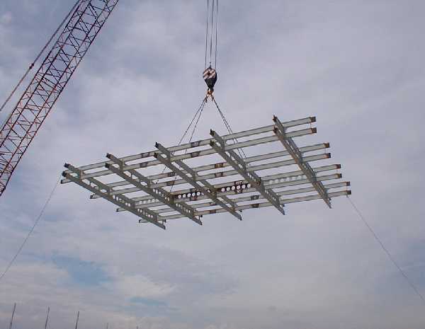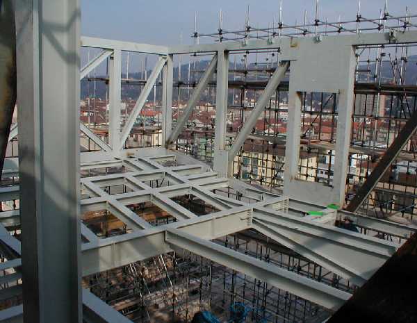Date le caratteristiche di scarsa portanza delle strutture del fabbricato esistente tutto il montaggio è stato fatto con una gru posizionata a terra. L’altezza di sollevamento è di circa 43 m, la larghezza del fabbricato di circa 80 m e lo sbraccio massimo di conseguenza è di circa 50÷60 m. E’ stata prevista una gru di grande portata in grado di sollevare carichi di circa 25 t alle distanze sopraindicate, in modo da poter prefabbricare, in officina e/o in aree di lavorazione predisposte a terra, grandi blocchi di strutture e ridurre al minimo i giunti da eseguire in opera.