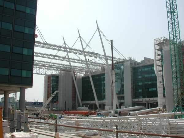 La copertura si estende su una superficie di 117 x 95 m (11.115 mq). La struttura portante è costituita da un graticcio di travi in acciaio, in cui si può leggere un’orditura principale di travi reticolari con sezione a cassone, poggianti alle estremità sui due corpi dell’edificio e nella parte mediana sui due pennoni strallati, e una secondaria di capriate reticolari piane. L’orditura principale è in effetti realizzata da cinque travi reticolari a cassone di sezione quadrata di 1.40 x 1.40 m poste ad interasse di 15.40 m e due travi laterali reticolari a cassone di sezione complessiva rettangolare di 3.50 x 2.50 m che poggiano sulle parti estreme del blocco hotel e del residence e collegano i due blocchi con una passerella pedonale ricavata all’interno delle strutture. Ogni trave principale appoggia sui corpi dell’ edificio e, nella parte mediana, è sostenuta da due piloni d’acciaio a sezione tronco-conica che, inclinati di 71.34° rispetto l’orizzontale, raggiungono la quota + 44.55 m. In prossimità della punta di ogni pilone partono 2+2 stralli di acciaio per poi agganciarsi ai due correnti superiori delle travi principali.