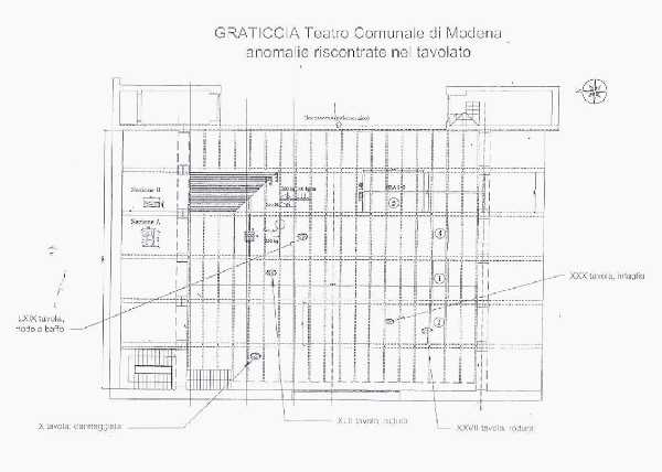 è costituita da tavole di Abete (e in qualche caso di pino) di sezione 4x11,5 cm. Circa metà delle tavole sono evidentemente più nuove rispetto alle altre. In corrispondenza dei lati destro e sinistro della scena, dove si concentrano molte pulegge per il sollevamento dei fondali, il legno appare di recente sostituzione. In queste aree in passato si erano manifestati dei cedimenti e crolli parziali della graticcia, sui cui resti furono prelevati i provini testati dal CNR-Istituto per la tecnologia del legno. Dall’analisi di tali provini emerse che i campioni esaminati presentavano un forte attacco da agenti xilofagi e si ritenne che l’insetto provocante il biodegradamento fosse il cosiddetto Capricorno delle case che altera notevolmente le caratteristiche fisico-meccaniche delle strutture lignee. Gli interventi curativi consistono in iniezioni e spennellature seguiti da interventi protettivi su tutto il resto del materiale con sostanze impregnanti.