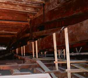 Il solaio della sala delle scenografie (fig 6) è visibile nel locale sottostante, l’ambiente in cui è visibile la centinatura della volta fonica. L’orditura principale è costituita da particolari travi composte (fig 7) su cui poggiano i travetti di sostegno delle pianelle. Tutto il solaio è stato oggetto di molteplici interventi, fra i quali il più recente è costituito in una diagnosi e in un successivo intervento di restauro, come mostrano gli abbondanti segni di sondaggi negli appoggi, le stuccature delle fessure e le cuciture con barre inghisate.