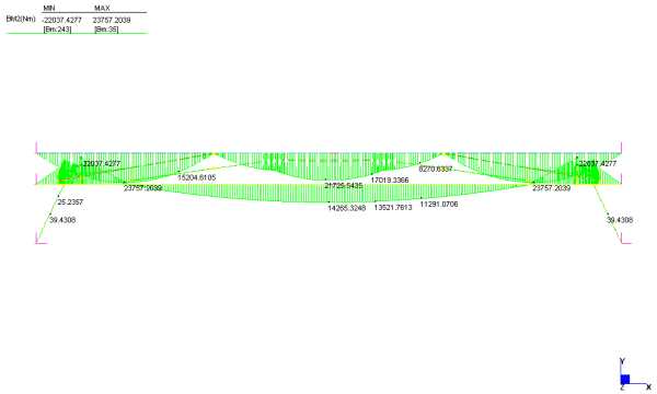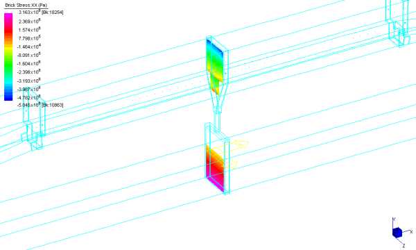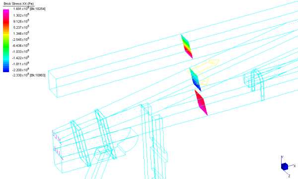 Dall’analisi numerica è stato possibile verificare che nelle zone centrali delle aste, lontano dagli appoggi il valore degli sforzi ottenuto con un a modellazione con elementi brick è del tutto simile a quello derivante da una modellazione con elementi beam (fig 19).