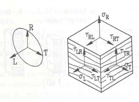In ogni punto della sezione retta di un tronco (sezione normale all’asse dell’albero) si può individuare oltre alla direzione parallela all’asse dell’albero in quel punto (direzione longitudinale L, normale al piano della sezione), una direzione tangente all’anello di accrescimento annuale in quel punto (dir. tangenziale), ed una direzione normale alla direzione tangenziale nel punto (direzione radiale R): tali direzioni costituiscono le tre direzioni di ortotropia (fig 13).