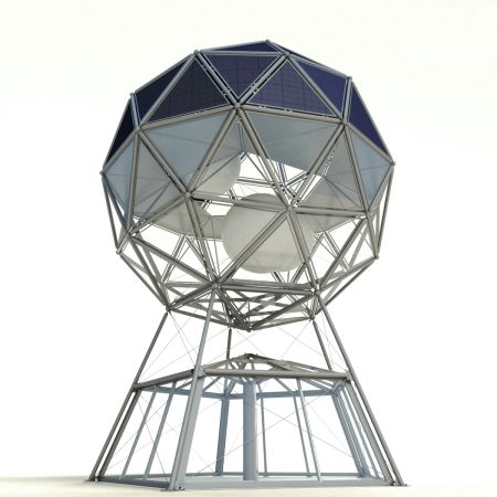 1. Breve descrizione - Diamante è il nome attribuito ad un prototipo di mini-centrale elettrica nella quale l’energia radiante solare viene trasformata in energia elettrica per mezzo di pannelli fotovoltaici opportunamente disposti sulla superficie di una sfera reticolare in acciaio posta ad una certa altezza dal suolo. La centrale ha la peculiarita', rispetto a un normale impianto fotovoltaico, di immagazzinare l'energia in appositi serbatoi sotto forma di ioni di idrogeno che alimentano batterie al litio. La sfera geodetica misura 4,0 m di raggio ed il suo centro è sostenuto a 7,63 m di altezza dal piano di imposta da una struttura reticolare sottostante all’interno della quale è situata la sala apparati. La sfera è formata da aste in acciaio inossidabile AISI 316L, di sezione circolare CHS 101.6x4 e lunghezza rispettivamente 2,472 m e 2,186 m, e da nodi sferici pieni di diametro 132 mm, in acciaio AISI 303. L’involucro del Diamante è costituito da 80 pannelli in vetro alloggiati nelle maglie triangolari del reticolo strutturale, di questi 38 saranno utilizzati per la produzione di energia mediante l’inserimento di celle fotovoltaiche nel materiale di interfaccia. Ciascun pannello è costituito da due lastre di vetro stratificato extralucido temperato chimicamente e spesso 10+6 mm, con interposto uno strato di PVB (polivinilbutirrale) di 1,52 mm di spessore. |
