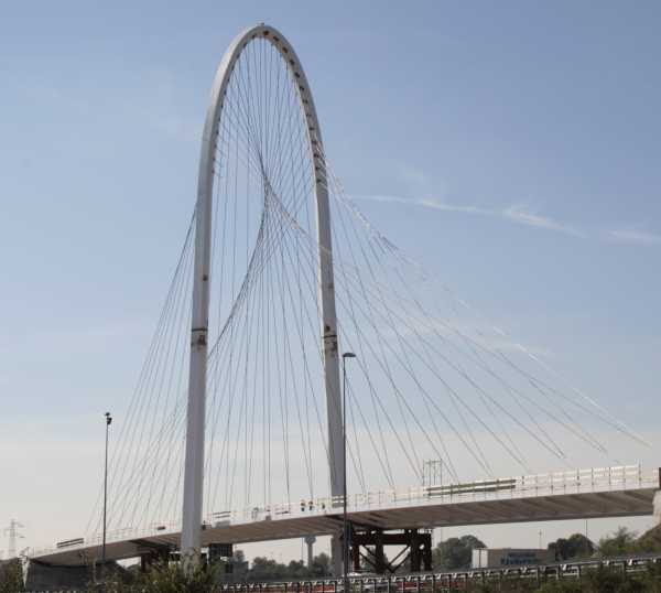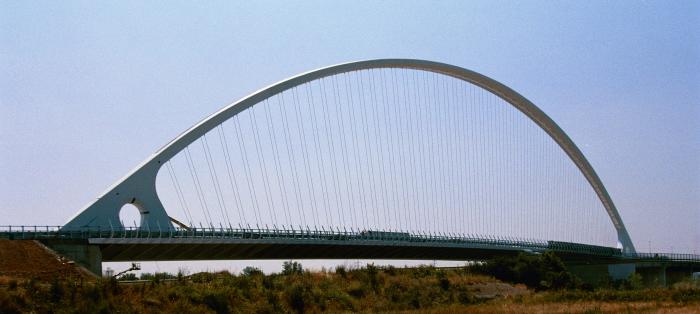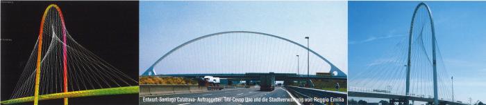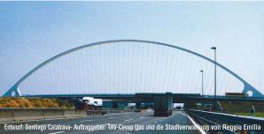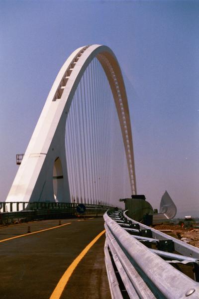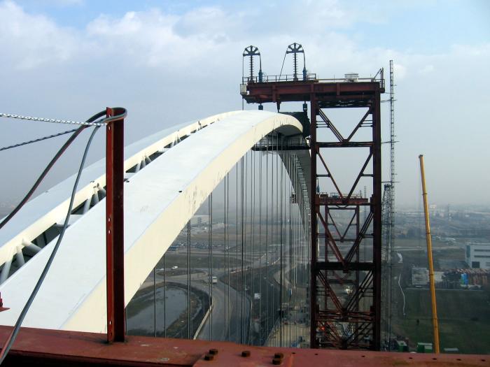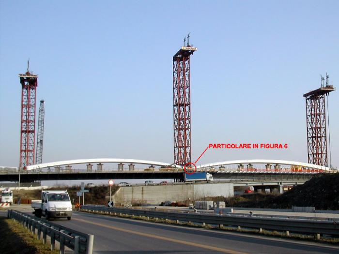 Il ponte centrale di scavalcamento dell’autostrada e dell’Alta Velocità si impone per la sua riconoscibilità nel paesaggio. La vela di questo ponte, bordata dall’arco superiore baricentrico alle due carreggiate (figg. 2 e 3), si eleva di 56 metri al di sopra del piano campagna. Il montaggio, da effettuare sopra l’autostrada del Sole e sopra al cantiere dell’Alta Velocità, ha imposto di ideare un sistema che rispettasse questi vincoli.