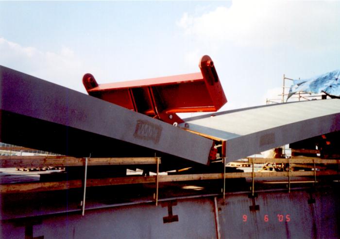Fig.6 - Particolare della cerniera provvisoria e bilancino di sollevamento