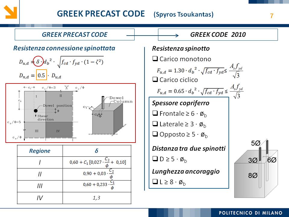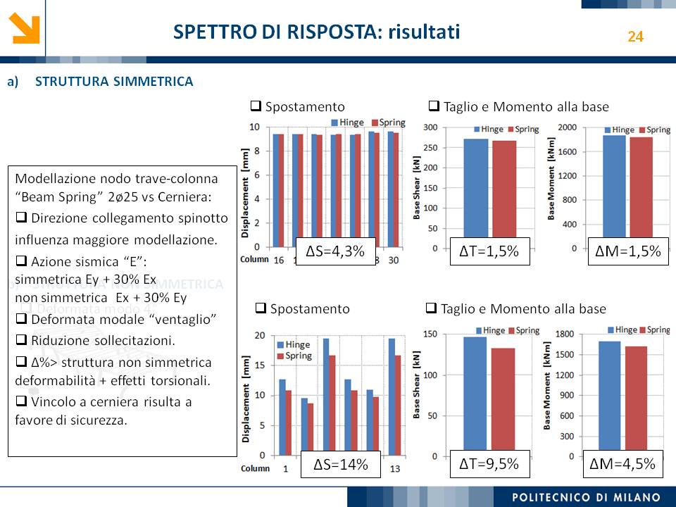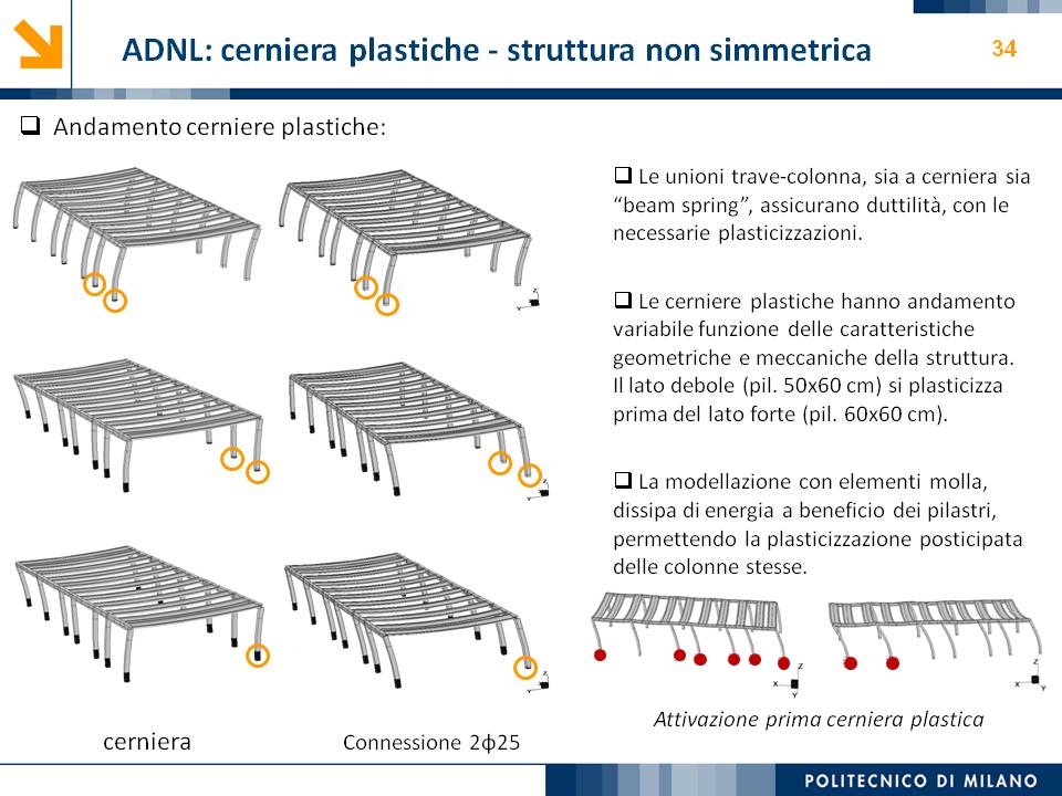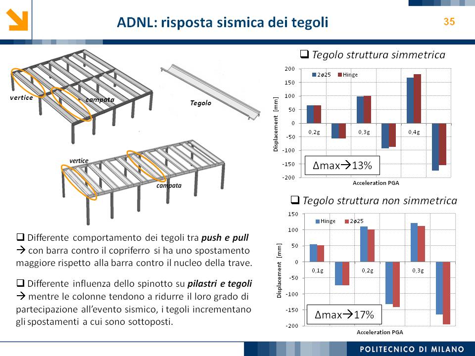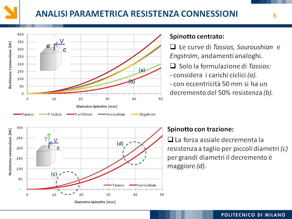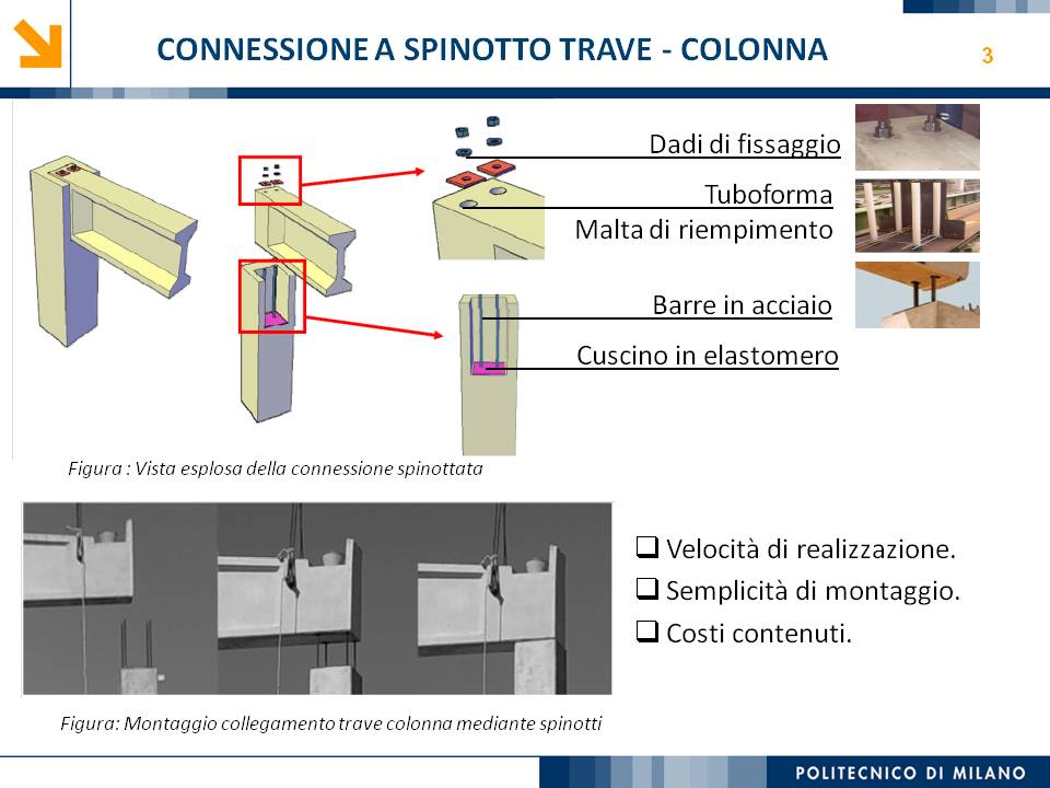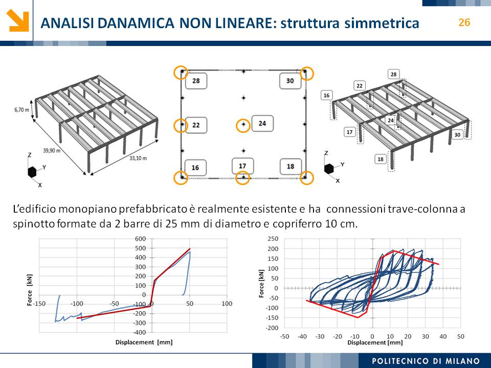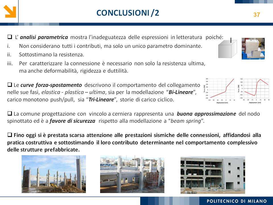 L’obiettivo dello studio presentato è qualificare e quantificare i parametri caratteristici del comportamento sismico, in termini di spostamento, resistenza, rigidezza e duttilità, delle connessioni a spinotto trave – colonna correntemente impiegate nelle strutture industriali prefabbricate. Queste connessioni sono tipicamente costituite da barre di acciaio ancorate nel pilastro e passanti in appositi alloggiamenti della trave, successivamente annegati con malta, in modo da garantire un comportamento pressoché a cerniera nel piano verticale e un comportamento rigido nel piano orizzontale. Nella tesi è riportata un’analisi parametrica relativa alle formulazioni attualmente presenti in letteratura per la valutazione della resistenza di tali connessioni, al fine di sottolineare pregi e difetti di ognuna. Viene inoltre presentata la procedura necessaria a caratterizzare il comportamento del collegamento in termini di forza-spostamento, sia a snervamento sia a rottura, mediante curva “Bi-Lineare” e “Tri-Lineare”. Tali procedure sono verificate attraverso una campagna sperimentale, realizzata nell’ambito del progetto di ricerca Europeo SAFECAST, di cui si riportano i set up delle prove e i risultati ottenuti per storie di carico sia monotono sia ciclico; i test sono stati condotti fino allo spostamento ultimo, in modo da determinare, in maniera dettagliata, la curva forza-spostamento caratterizzante la connessione. La definizione “Bi-Lineare” e “Tri-lineare” del comportamento del collegamento spinottato è stata applicata nella modellazione ad elementi finiti di due strutture prefabbricate monopiano ad uso industriale, simmetrica e non, realmente esistenti. Su tali strutture sono state condotte analisi dinamiche non lineari, Time History, al fine di evidenziare la differente risposta, da parte dell’edificio soggetto a sisma, tra l’innovativa modellazione della connessione spinottata con elementi “Beam Spring” e il classico vincolo a semplice cerniera, attualmente adottato nella comune pratica progettuale. Lo studio presentato cerca di colmare le lacune nella conoscenza del comportamento sismico delle connessioni spinottate trave-colonna, promuovendo lo sviluppo di strumenti numerici appropriati, attendibili e verificati sperimentalmente, da utilizzare nella progettazione di strutture prefabbricate in zone sismica sfruttando le proprietà delle stesse connessioni. Il software utilizzato per le modellazioni FEM e' il codice di calcolo Straus7. |