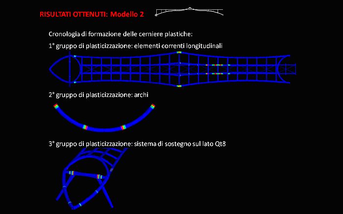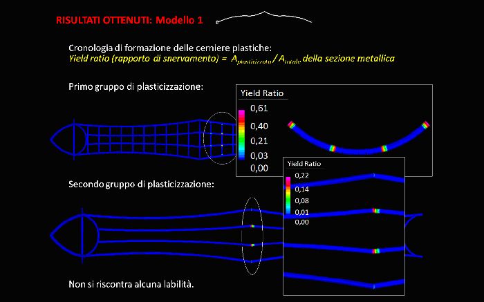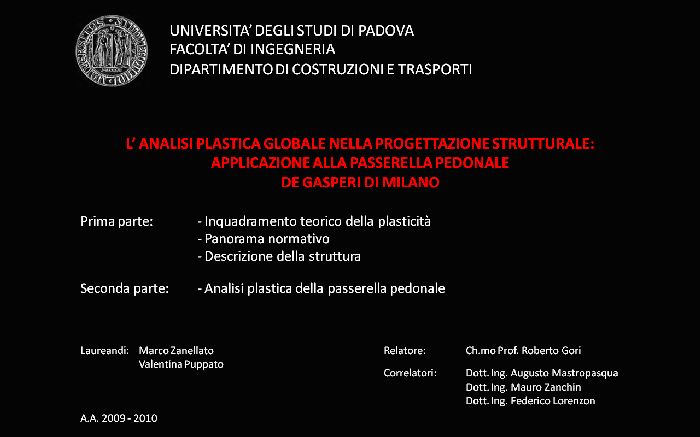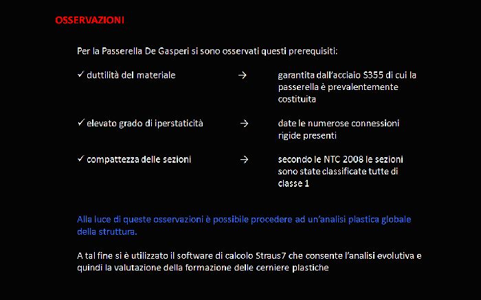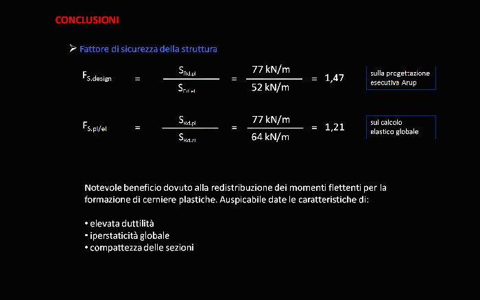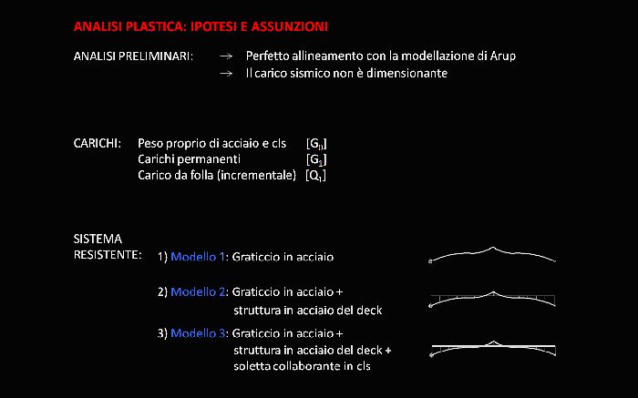 Alla luce delle più recenti normative nazionali ed europee, vengono introdotte ed analizzate le metodologie di calcolo plastico a rottura previste in sede normativa. In aggiunta ai più didattici metodi di calcolo rigido-plastico (metodo cinematico) ed elasto-plastico (metodo evolutivo) vengono introdotte le possibili analisi elasto-plastiche non-lineari incrementali, condotte per mezzo di codici di calcolo ad elementi finiti, ed applicate in particolare per sistemi strutturali a geometria complessa e forma non regolare. Lo studio è stato applicato al complesso metallico denominato “passerella De Gasperi” di Milano (Progettista Esecutivo dell’opera: società ARUP ITALIA S.R.L.), sistema di luce 60 m attualmente in realizzazione, di forma non regolare, indagando dapprima l’idoneità normativa per l’applicabilità del calcolo plastico globale secondo EN1993-2005 ed NTC2008, e procedendo poi all’estrazione degli effettivi moltiplicatori critici di collasso plastico. Le analisi numeriche sono state condotte per mezzo del codice FEM Straus7 solutore non-lineare per geometria e materiale, con specifici requisiti di accoppiamento assial-flessionale nella risposta del materiale e progressiva formazione di elasto-plasticità nella sezione.
