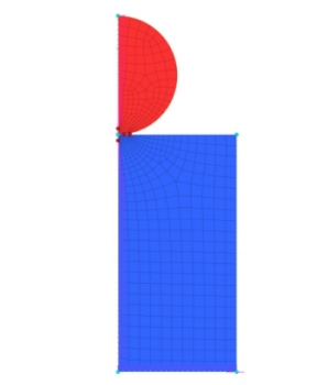 La modellazione è avvenuta sfruttando la simmetria e posizionando gli elementi di contatto nell’interfaccia tra i due corpi (figg. 4 e 5).