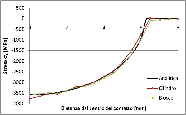 Si vuole allora cercare l’andamento delle tensioni normali sulle superfici dei corpi a contatto, a partire dal centro verso la periferia. Nella figura 6 è rappresentato il plottaggio di tali tensioni intorno alla zona del contatto, mentre in fig. 7 è riportato il confronto tra i risultati ottenuti con Straus7, sulle superfici di cilindro e blocco, e la soluzione analitica.