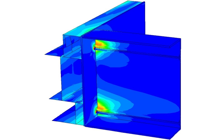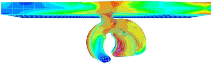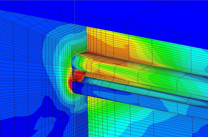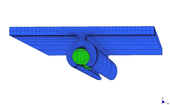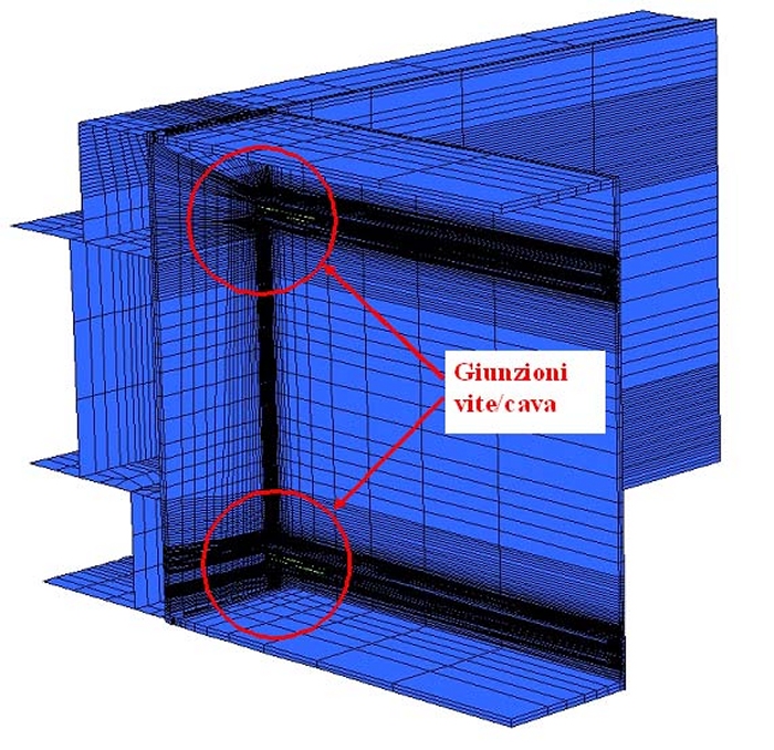 Come si osserva dal grafico si è ottenuta un’ottima corrispondenza tra le curve. Come ultima serie di analisi si è modellato un giunto completo, utilizzando una combinazione di elementi Brick e Shell sfruttandone le simmetrie (fig. 13), in modo da diminuire il più possibile i tempi di calcolo.