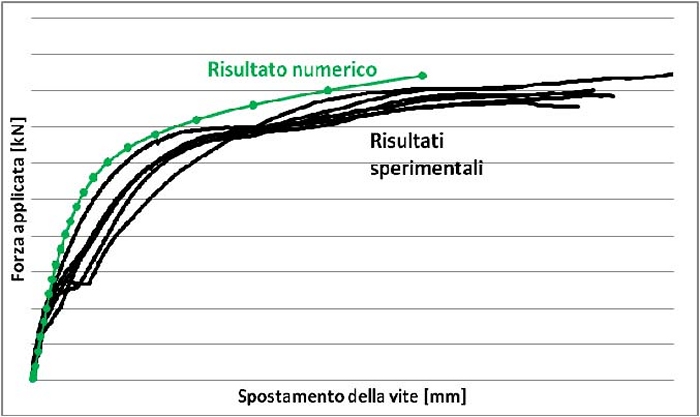 Per una ulteriore comparazione tra analisi numerica e sperimentale si sono sovrapposte le curve forza-spostamento ottenute da tale analisi agli elementi finiti e quelle ottenute dalle prove in laboratorio (fig.12).