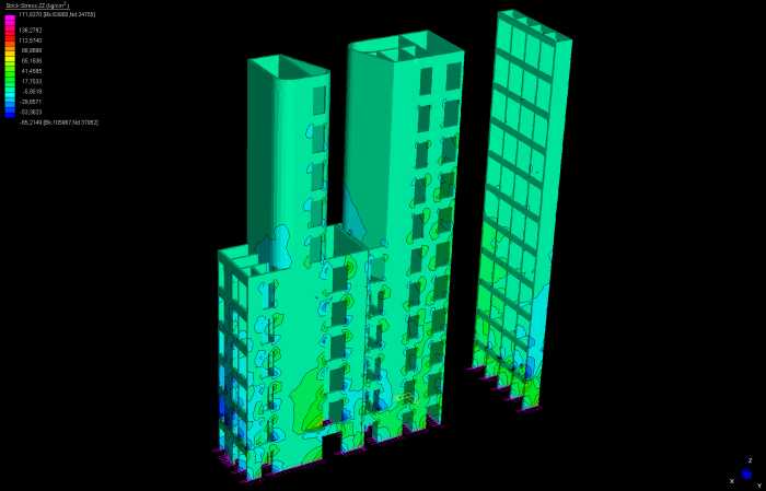 Considerando che a livello 0,00 il solaio del corpo “A” presenta un giunto strutturale perimetrale tale da rendere questa parte dell’edificio distinta dalla rimanente, si è previsto di fondare questa parte di edificio su pali di grosso diametro spinti fino alla profondità di m 38/40 dal piano campagna. Detti pali con testa palo a -7,55 sono collegati da elementi di raccordo, travi e platee di altezza cm 180.