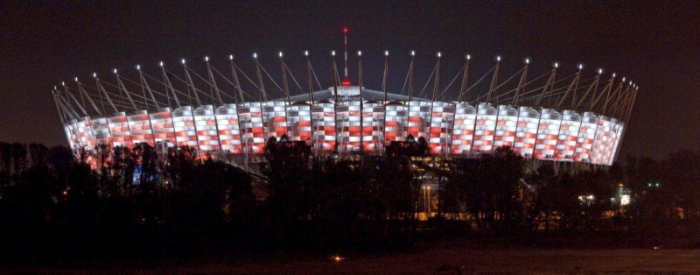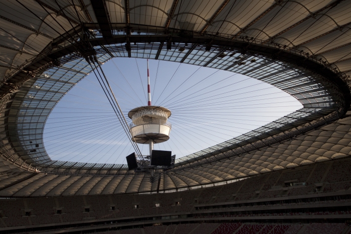 Il nuovo stadio nazionale di Varsavia ha una capienza di 55.000 posti a sedere. La copertura, del peso complessivo di 15.000 tonnellate, e' una tensostruttura sull'intera superficie, completamente ancorata dall'esterno mediante un meccanismo a sviluppo circolare formato da 72 colonne (profilo CHS 1016mm x 30-70mm) disposte in pianta lungo una circonferenza di 300 metri di diametro, un anello di contrasto detto compression ring (profilo CHS 1820mm x 80mm), pennoni di appensione dei cavi, detti inclined struts (profilo CHS da 1200 a 600mm x 35-45mm), contrasti di ancoraggio esterno, detti facade tie (profilo CHS 508mm x 20-50mm). La copertura vera e propria e' realizzata mediante un doppio ordine di cavi radiali (72 superiori di diametro 70-140mm e 72 inferiori di diametro 70-150mm) che, partendo dal perimetro esterno della struttura, convergono verso il centro e si ancorano sul mozzo centrale, detto centerspire. Il centerspire e' sospeso sulla verticale di centrocampo, ha una sezione tubolare di dimensione variabile da 1600x25mm a 300x5mm, ha un'altezza di 70m e pesa 200t. Lungo il fusto del centerspire sono ancorati il cosiddetto garage ed il video cube. Il garage e' la struttura a forma di pagoda circolare che contiene la membrana retraibile di copertura, movimentata da quattro argani quando il tetto e' in posizione chiusa. Il video cube e' la struttura di supporto dei maxischermi. E' costituito da 4 bracci reticolari disposti a croce. Ciascun braccio sostiene uno schermo del peso di 8t. |